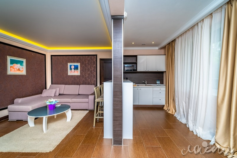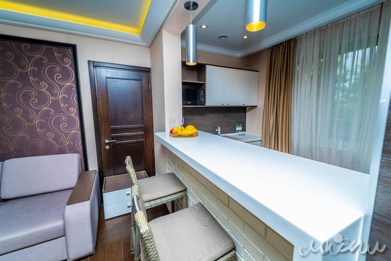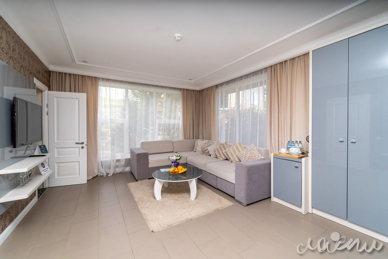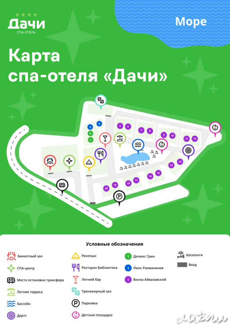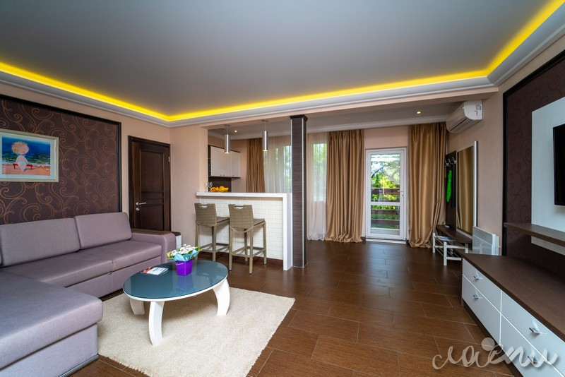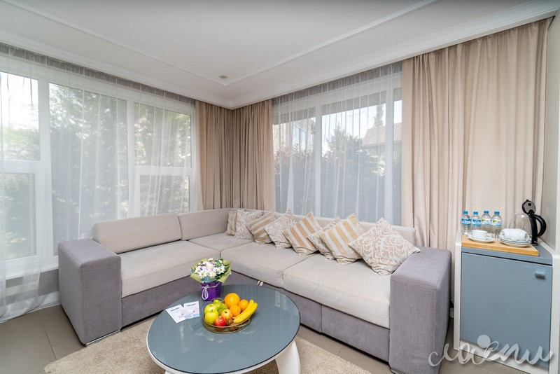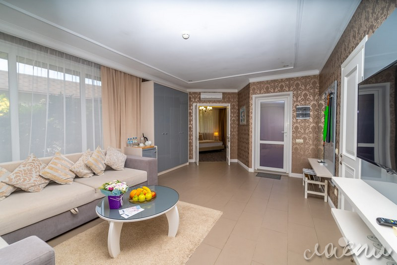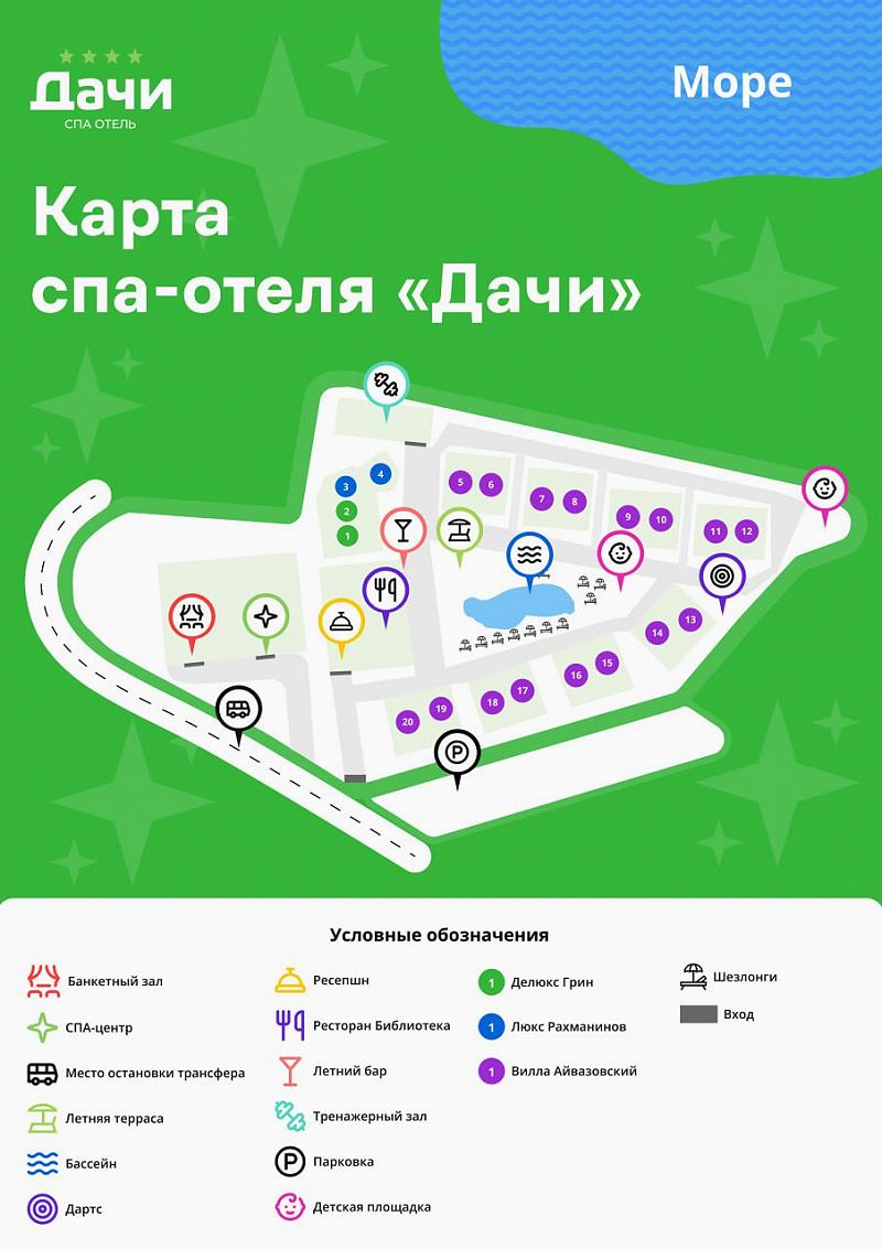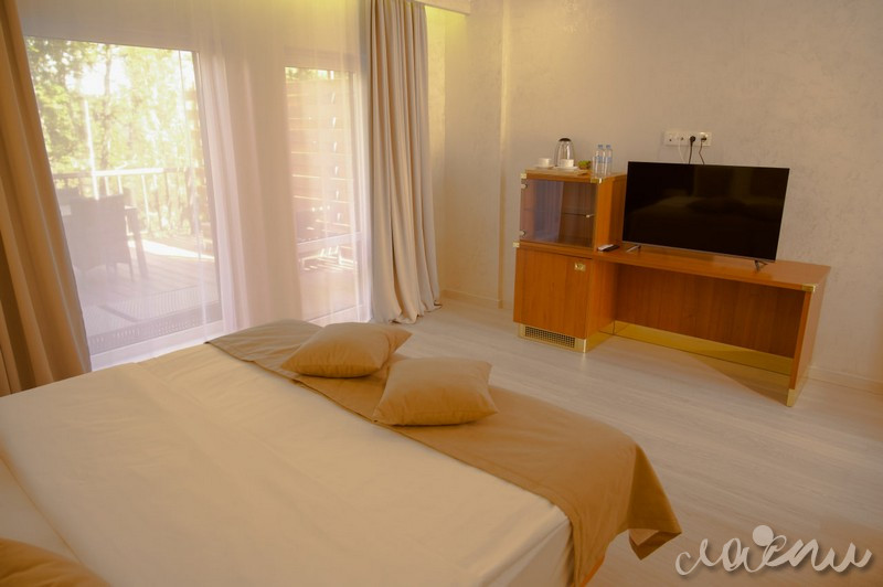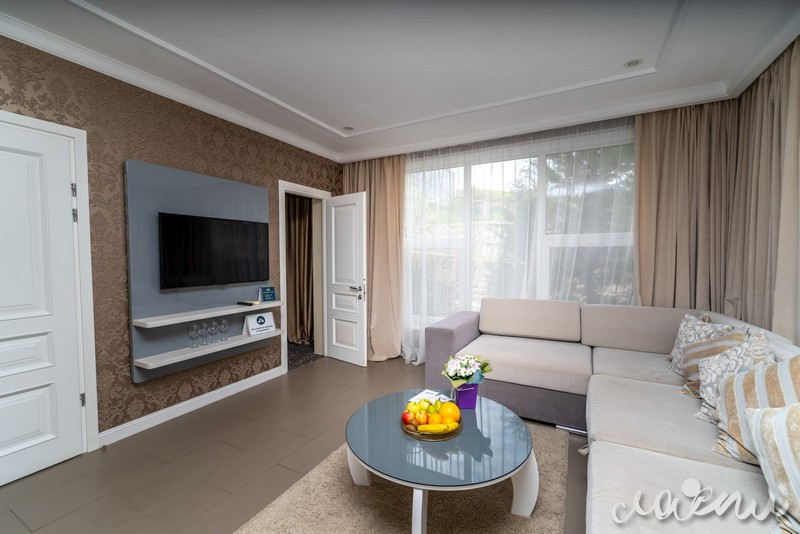 Для проживания отель предлагает премиальные комфортабельные номера и виллы с просторными террасами. На территории отеля открытый подогреваемый бассейн, СПА-комплекс, ресторан авторской кухни «Библиотека», тренажерный зал, закрытая охраняемая территория. Для юных гостей создан детский клуб с опытным воспитателем, анимационная программа, игровая площадка и детское меню из экологически чистых фермерских продуктов.